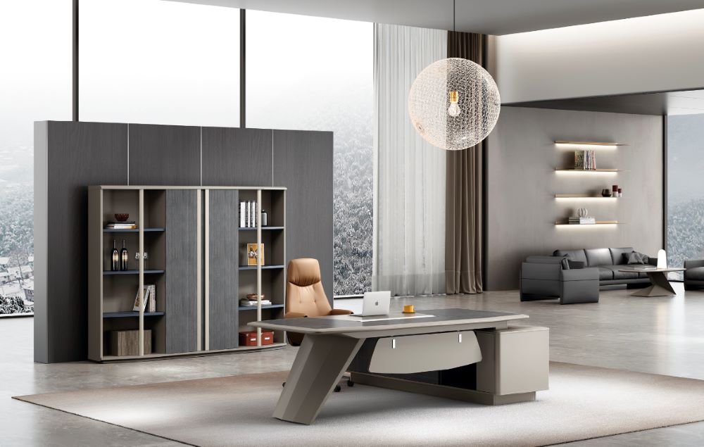 说明:1.选用高品质中纤板,握钉力强,吸水膨胀率低,游离甲醛含量达到E1级标准,板材须经专业干燥处理,拼贴严密、平整、无裂纹、压痕和划伤,倒棱、圆角均匀一致;2.采用三截静音滑轨,缓冲门铰,抽屉配置密码锁3.高档香槟金色拉手,内嵌超纤皮革装饰,质感高级;4.桌面加厚至4cm,中纤板基材,四周倒斜角处理,内嵌银丝梨木装饰;封边采用五底三面油漆封边工艺;线槽位镶嵌卡拉白色岩板,美观精致纹理清晰;写字位选用优质超纤皮