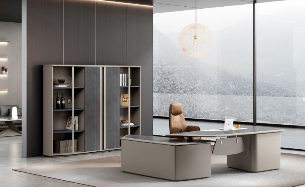 说明:1.选用高品质中纤板,握钉力强,吸水膨胀率低,游离甲醛含量达到E1级标准,板材须经专业干燥处理,拼贴严密、平整、无裂纹、压痕和划伤,倒棱、圆角均匀一致;2.采用三截静音滑轨,缓冲门铰,抽屉配置密码锁3.高档香槟金色拉手,内嵌超纤皮革装饰,质感高级;4.桌面加厚至4cm,中纤板基材,四周倒斜角处理,内嵌银丝梨木装饰;封边采用五底三面油漆封边工艺;线槽位镶嵌卡拉白色岩板,美观精致纹理清晰;写字位选用优质超纤皮革饰面;5.上海宝钢基材,均经过酸